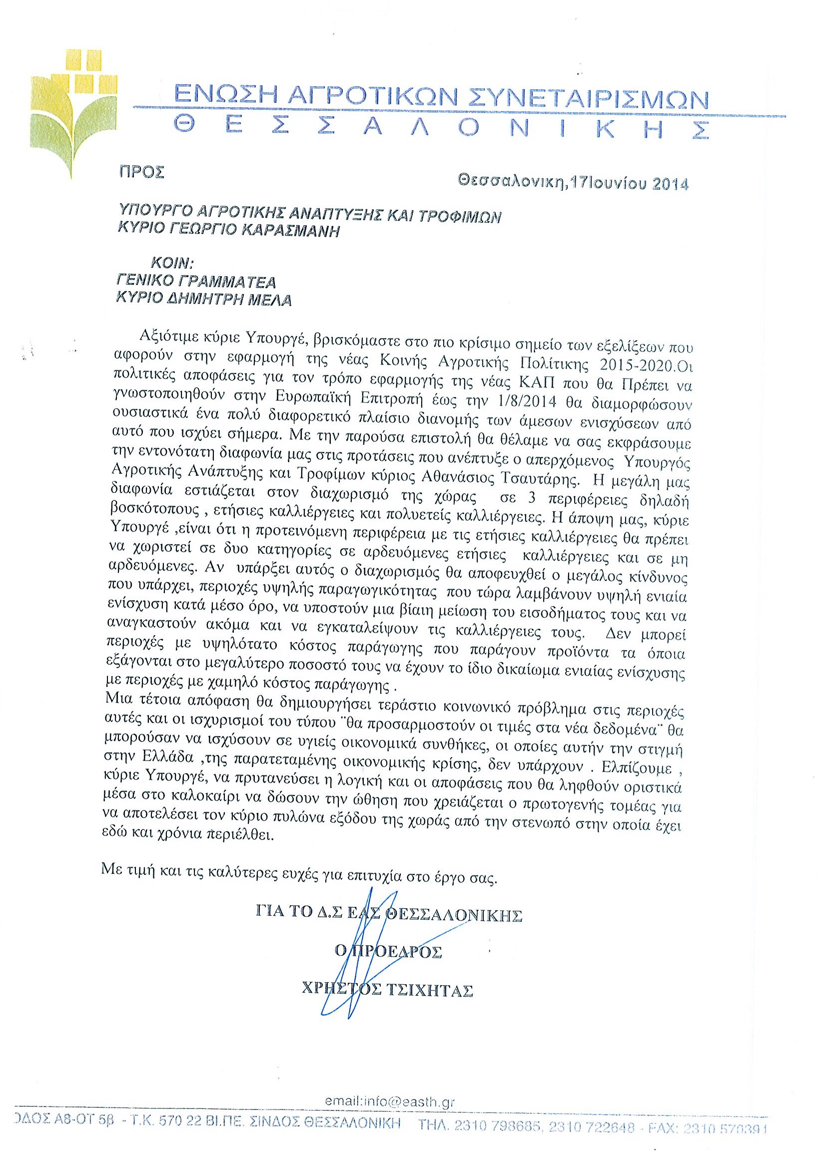 Επιστολή Προέδρου ΕΑΣ Θεσσαλονίκης κ. Χρήστου Τσιχήτα στον Υπουργό Αγροτικής Ανάπτυξης και Τροφίμων Twitter
